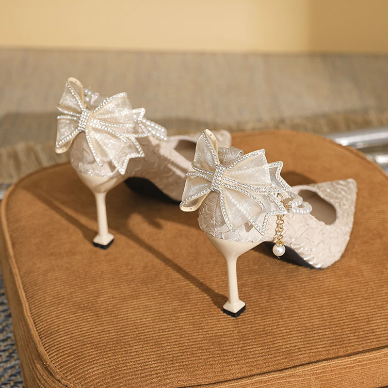 Elegant Beige Textured Fabric Pointed Toe Comfortable Summer Stiletto Heel Pumps with Pearl Bow & Rhinestone Accent for Women